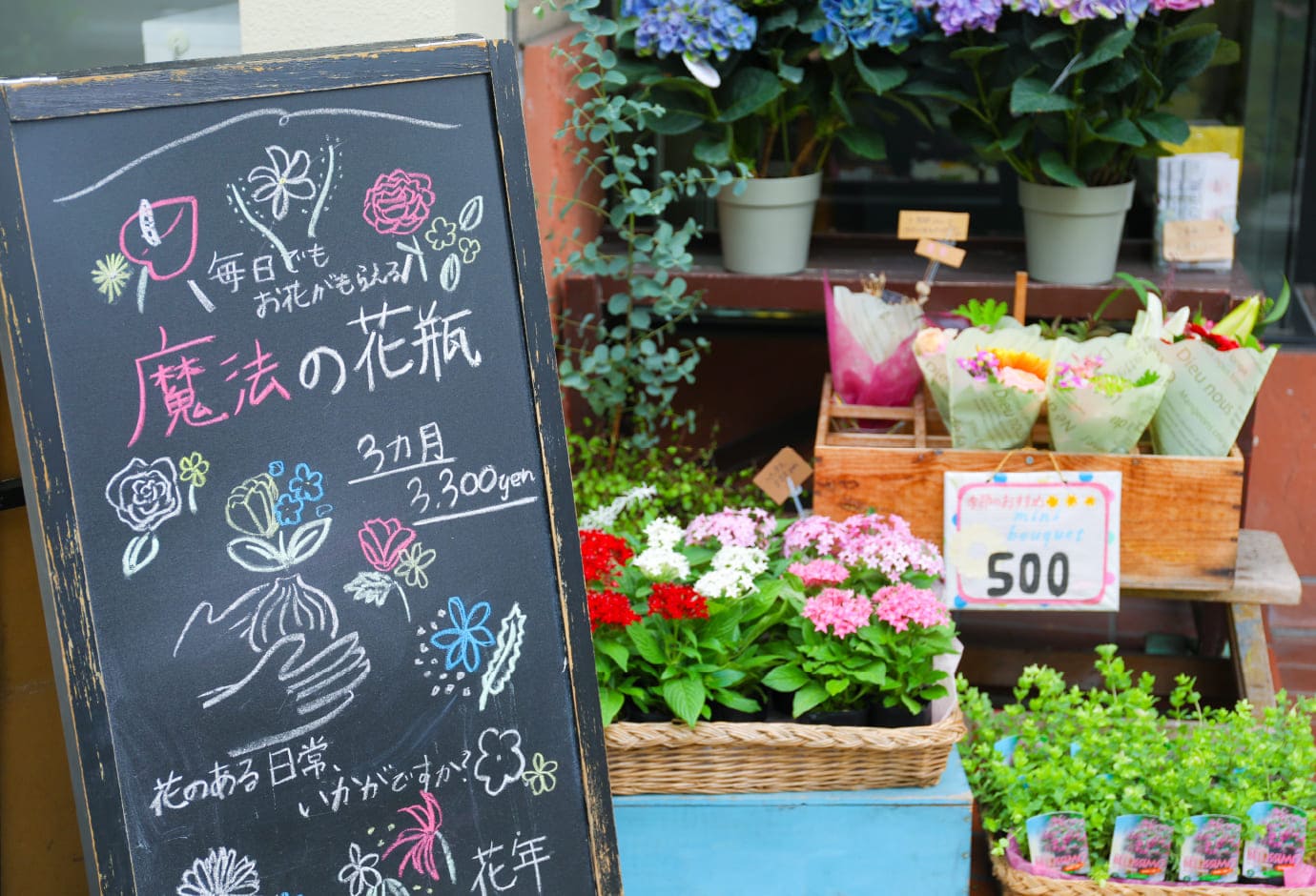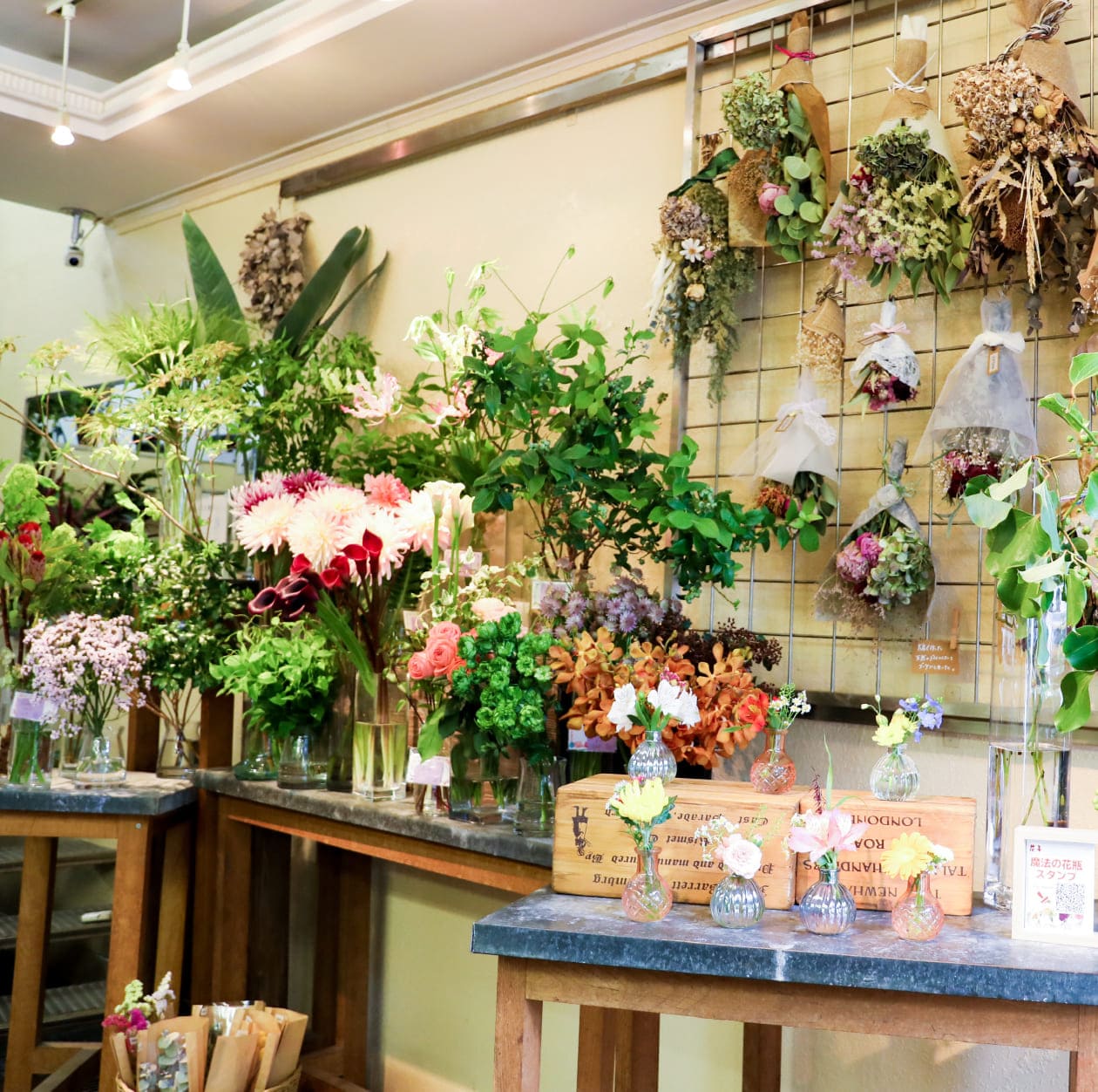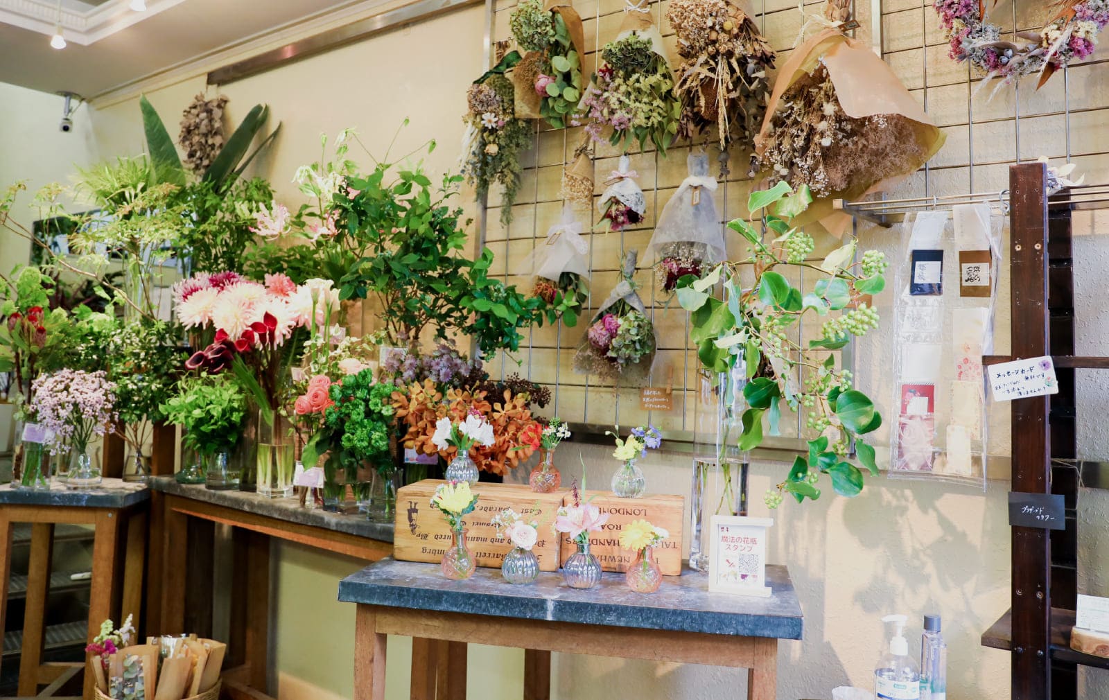千種駅徒歩3分、名古屋のど真ん中に店舗を構えております。こじんまりとした店内ではございますが、毎日新鮮な生花やアレンジメント・花束に必要な花瓶、ドライフラワーの飾りとして人気のあるスワッグなど、お好みのお花を実際にお選びいただけます。それぞれのお花に対するケアの仕方やリアルタイムでお勧めのお花など、当店のお花のプロになんでもご相談ください。きっと、お好きなお花を見つけていただけます。